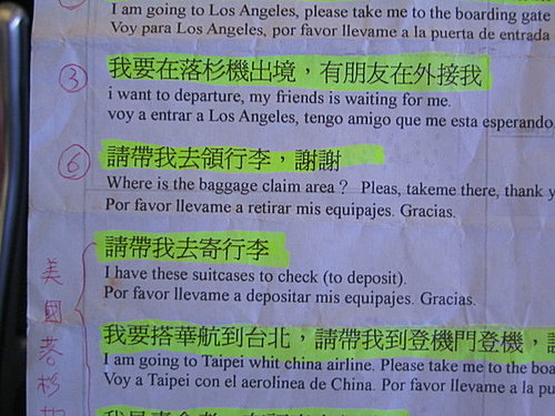 小抄第一行,用中文寫著『我要到哥斯大黎加看女兒,請問是在這裡轉機嗎?』