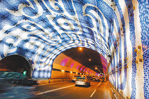 趕在台北聽奧期間,自強隧道美化工程終於完工,以故宮典藏國寶文物為元素妝點隧道拱頂,還有隧道內的透光玻璃纖維馬賽克鑲嵌圖騰等,大幅提昇駕駛人的照明視線,也要讓外國觀光客感到驚豔。