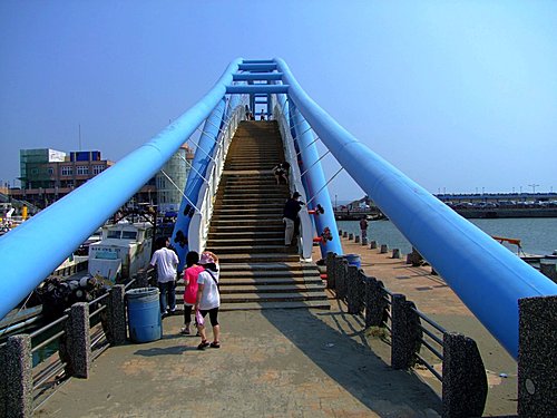 觀海橋,這座拱形的鋼橋選用藍色,橋身主體紅色、欄杆為白色,全長110公尺,十分搶眼,夜間還散發出五彩燈光,煞是美麗,早已成為遊客到此必遊的景點之一。