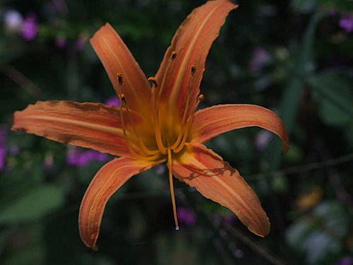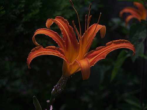 橙色花頂生,花瓣六片呈橘黃色,有深紅色斑點。